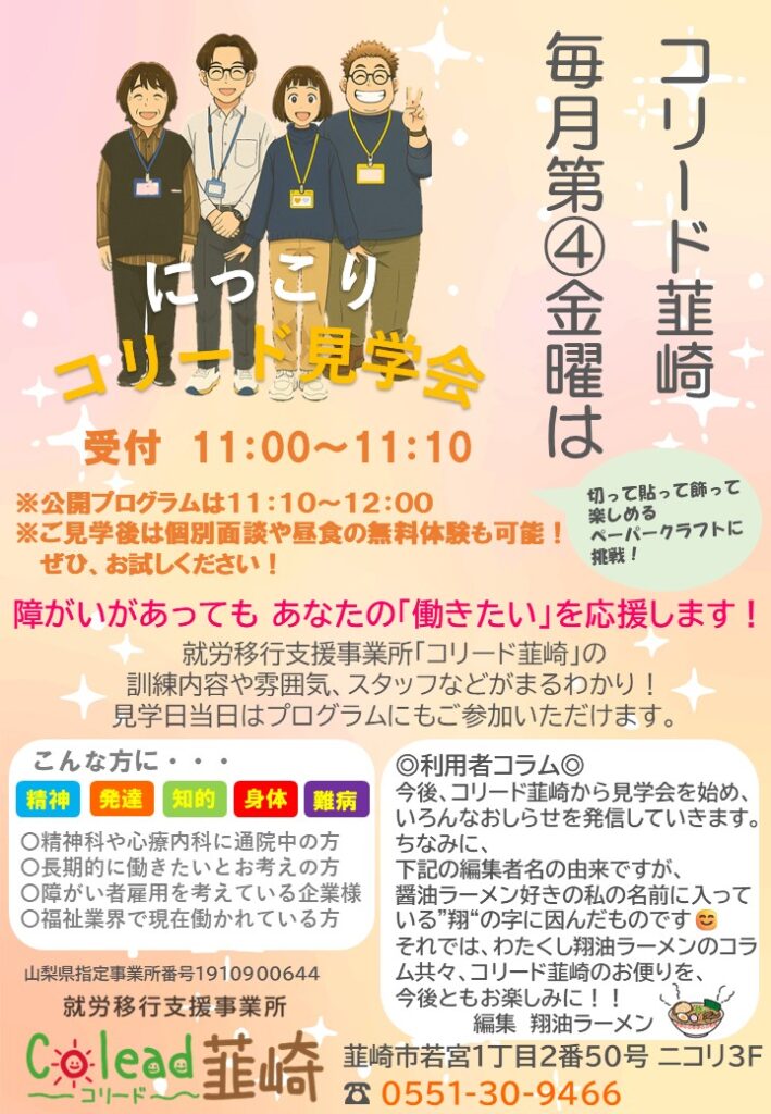 ✉:nirasaki@colead-co.jp(電話が苦手な方でも大丈夫!メールでお気軽にお問い合わせください!)
