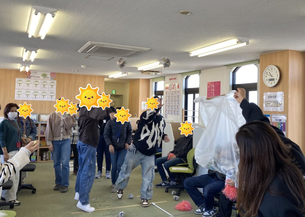 ④玉入れ・・玉になっていない新聞紙を丸めるところからスタート!どんな丸め方がビニール袋に入れやすいかな?玉を丸める人、投げる人との連携も必要!スタート前の作戦会議もポイントのひとつ☝ やっぱりコミュニケーションが大切ですね!