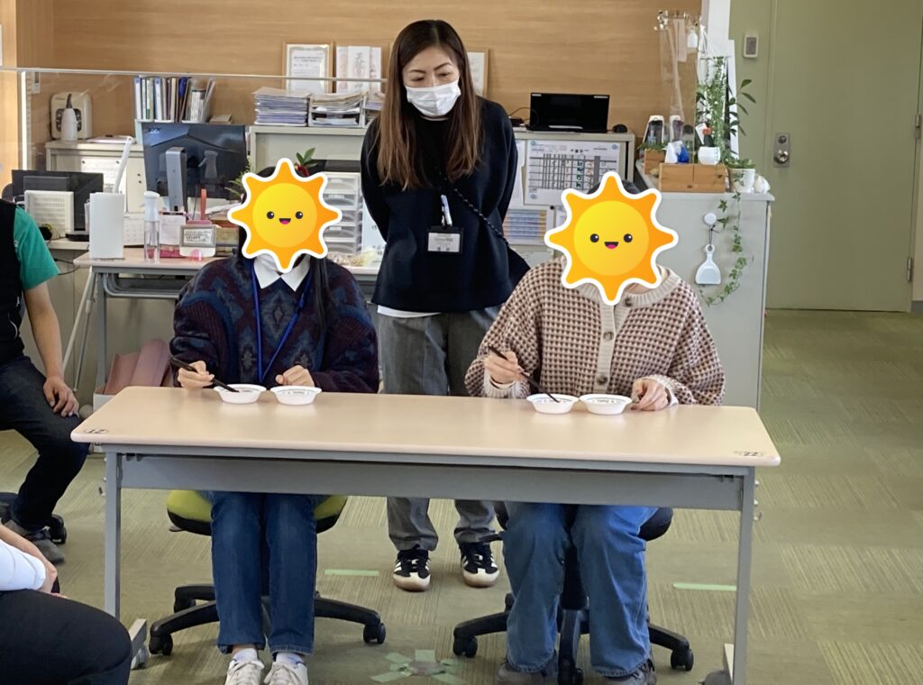⑥豆つかみ・・大豆orポップコーン、どちらにするかをジャンケンで決め、時間内に隣のお皿に多く移動させた人の勝ち‼手先の訓練や、集中力を必要とする競技です☺