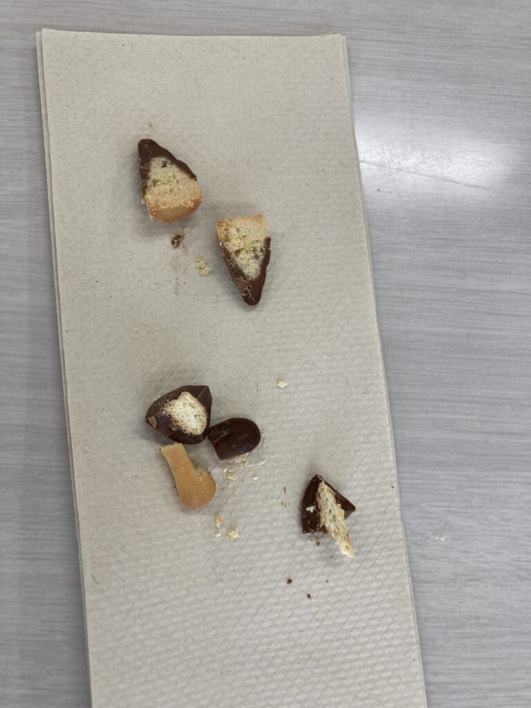 ちょうど、手元にきのこの山とたけのこの里があったので、みんなで断面を見てみました!