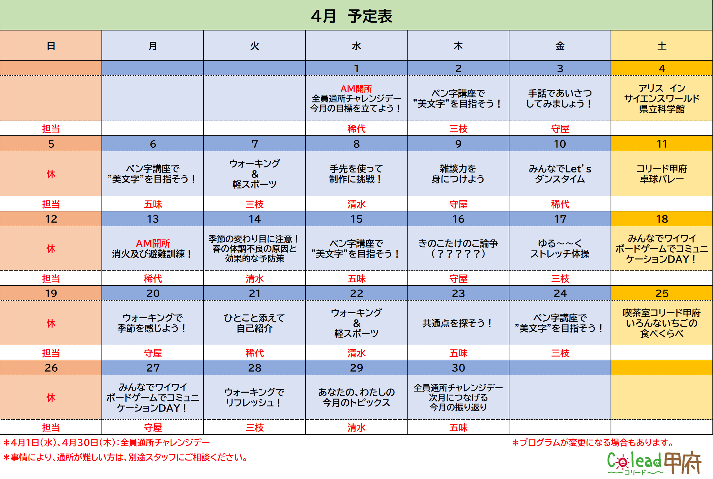 4月もなるべく利用者さんの生活リズムが乱れることなく、